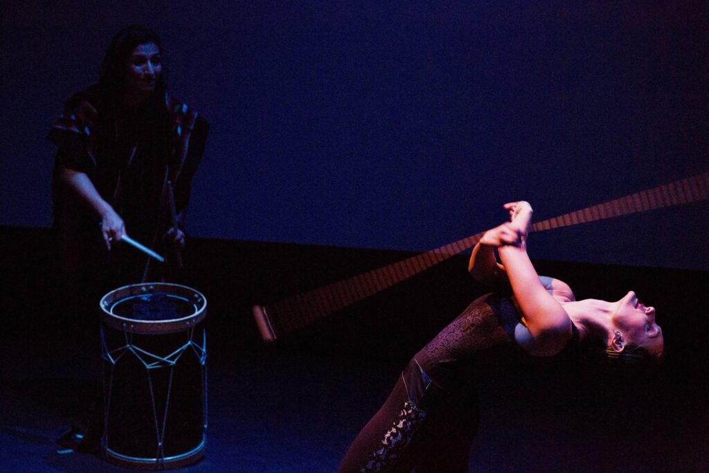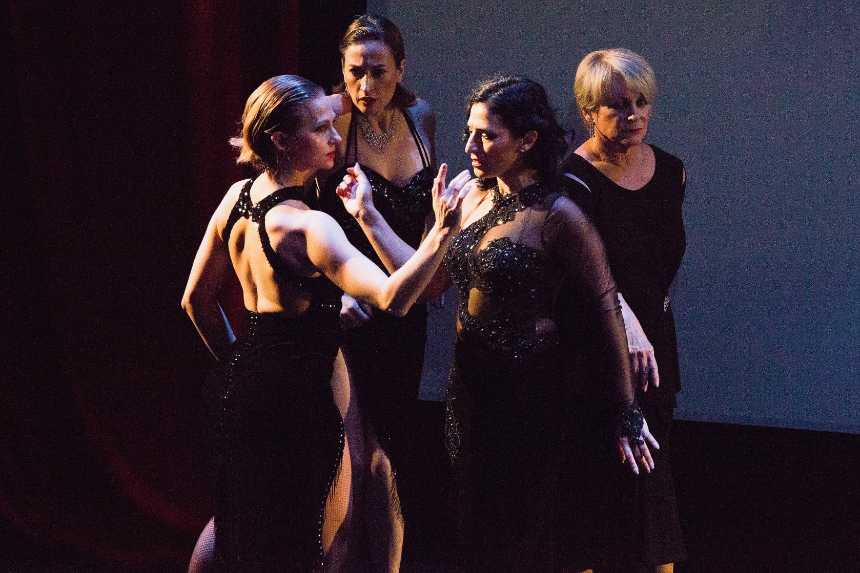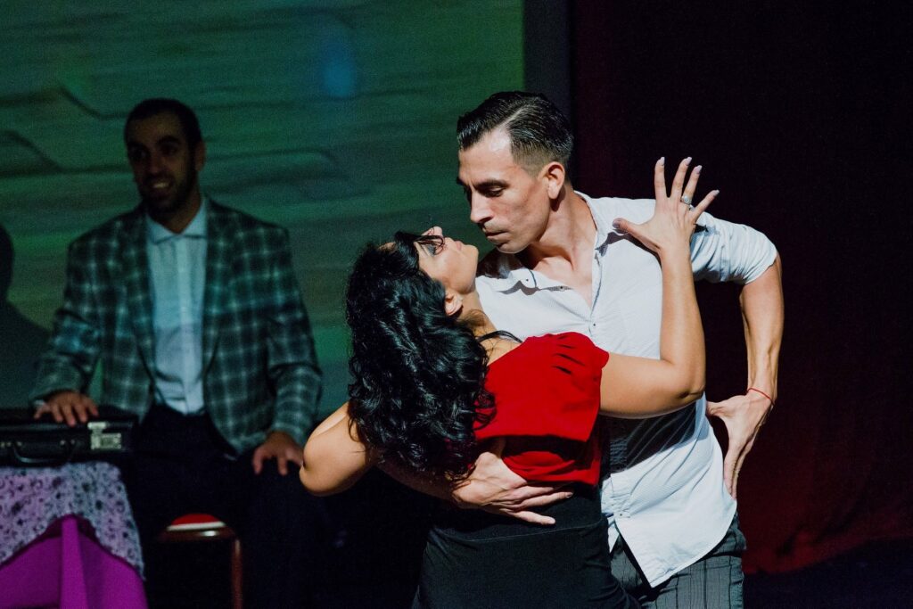 Some scenes during the show were set as a milonga (tango dance social) with tables and chairs, and images of a local milonga, El Encuentro at the Tango Room, displayed on the background screen.